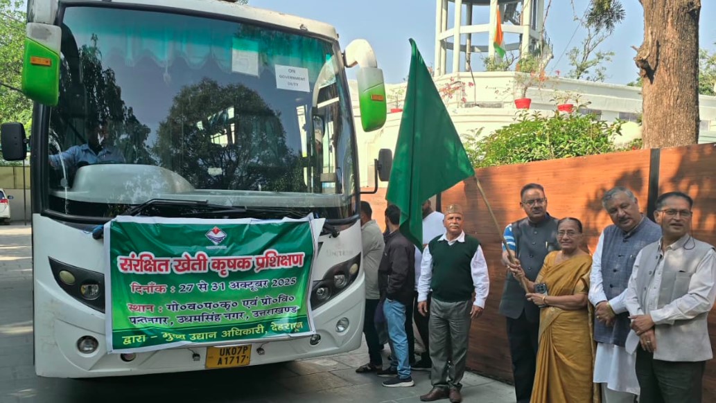 देहरादून- जनपद देहरादून के 28 प्रगतिशील सब्जी उत्पादक कृषकों के समूह को प्रदेश के कृषि एवं उद्यान मंत्री गणेश जोशी ने आज गोविन्द बल्लभ पंत कृषि एवं प्रौद्योगिकी विश्वविद्यालय, पंतनगर में पांच दिवसीय संरक्षित खेती पर प्रशिक्षण हेतु बस को हरी झंडी दिखाकर रवाना किया।