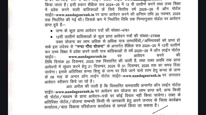 देहरादून- नंदा गौरा योजना के लिए अब 20 दिसंबर तक आवेदन किया जा सकता है। कैबिनेट मंत्री रेखा आर्या के निर्देशों के क्रम में विभाग ने आवेदन की अंतिम तारीख बढ़ाने का फैसला किया है। कैबिनेट मंत्री रेखा आर्या ने बताया कि पहले इस योजना के लिए आवेदन की अंतिम तारीख 30 नवंबर तय की गई थी। कन्या जन्म के आधार पर योजना का लाभ लेने और 12वीं उत्तीर्ण करने के बाद इस योजना के तहत सहायता प्राप्त करने के लिए अभी तक 30000 से ज्यादा आवेदन प्राप्त हो चुके हैं।