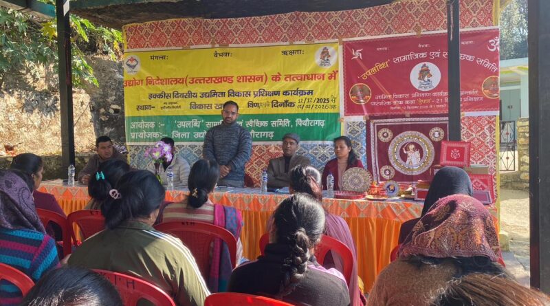 पिथौरागढ़ (मूनाकोट/विण): सीमांत जनपद पिथौरागढ़ की ग्राम सभाओं मड़ खड़ायत और सिलौली में, महिलाओं और ग्रामीणों को आर्थिक रूप से स्वावलंबी बनाने और पलायन (Migration) पर प्रभावी रोक लगाने की दिशा में एक महत्वपूर्ण पहल शुरू की गई है। उद्योग निदेशालय (उत्तराखंड शासन) के तत्वाधान में सामाजिक संस्था “उपलब्धि” द्वारा 21 दिवसीय उद्यमिता विकास प्रशिक्षण कार्यक्रम का शुभारंभ किया गया, जो 12 दिसंबर 2025 से 01 जनवरी 2026 तक चलेगा।