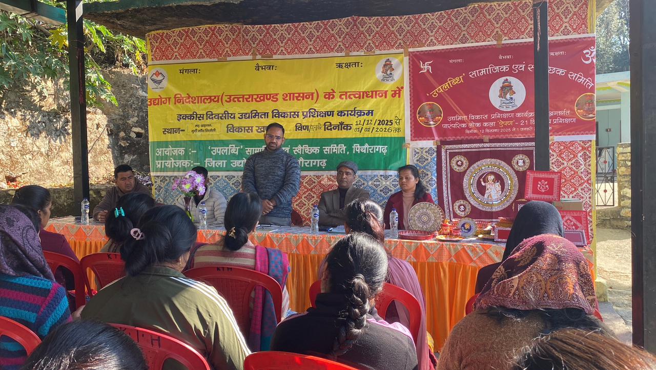 पिथौरागढ़ (मूनाकोट/विण): सीमांत जनपद पिथौरागढ़ की ग्राम सभाओं मड़ खड़ायत और सिलौली में, महिलाओं और ग्रामीणों को आर्थिक रूप से स्वावलंबी बनाने और पलायन (Migration) पर प्रभावी रोक लगाने की दिशा में एक महत्वपूर्ण पहल शुरू की गई है। उद्योग निदेशालय (उत्तराखंड शासन) के तत्वाधान में सामाजिक संस्था “उपलब्धि” द्वारा 21 दिवसीय उद्यमिता विकास प्रशिक्षण कार्यक्रम का शुभारंभ किया गया, जो 12 दिसंबर 2025 से 01 जनवरी 2026 तक चलेगा।